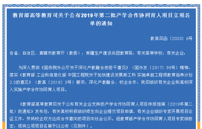 近日,教育部公布了《教育部高等教育司关于公布2019年第二批产学合作协同育人项目立项名单的通知》(教高司函〔2020〕6号),公司机器人应用研究院执行经理胡斌博士申报的“智能制造教育中的机器人公共实训平台建设”获批新工科建设类项目立项。