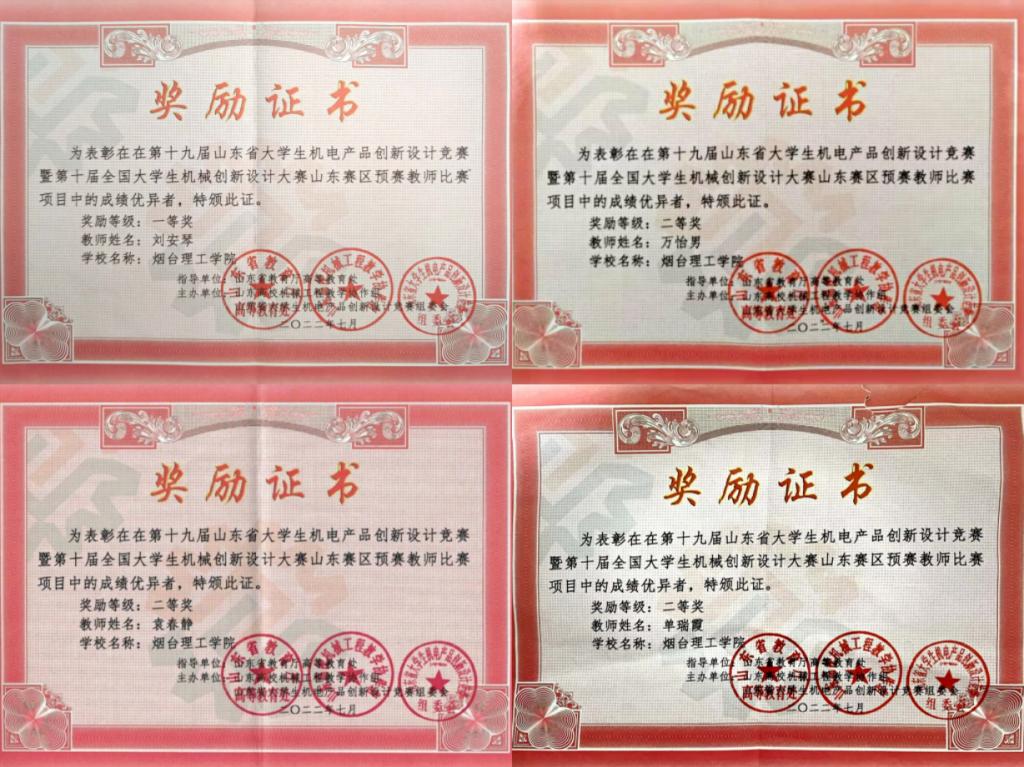 近日,由山东省教育厅高等教育处指导,山东省高校机械工程教学协作组和山东省老员工机电产品创新设计竞赛组委会主办的,第十九届(2022年)山东省老员工机电产品创新设计竞赛暨第十届全国老员工机械创新设计竞赛(以下简称“竞赛”)山东赛区教师比赛落下帷幕,太阳成集团tyc33455ccwww教师刘安琴荣获一等奖,万怡男、袁春静、单瑞霞分别荣获二等奖。