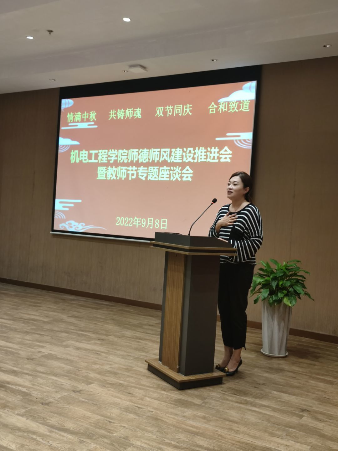 座谈会由办公室主任孙倩主持。经理致辞,在预祝双节的同时对教师们提出了“为人师表,立德树人”的教育理念和不断求发展的殷切期望,并鼓励教师积极努力工作,对学院工作多提宝贵意见和建议。党总支书记邓之增对机电学院上半年工作回顾与总结,副经理刘安琴、王亚平,主任教授马国清、王卓及各系主任、教师代表等分别发言,进行各方面工作和生活上的指导和经验交流。最后,李洁助理对公司工作做出充分肯定和鼓励,并对今后的整体工作提出新的要求和希望。