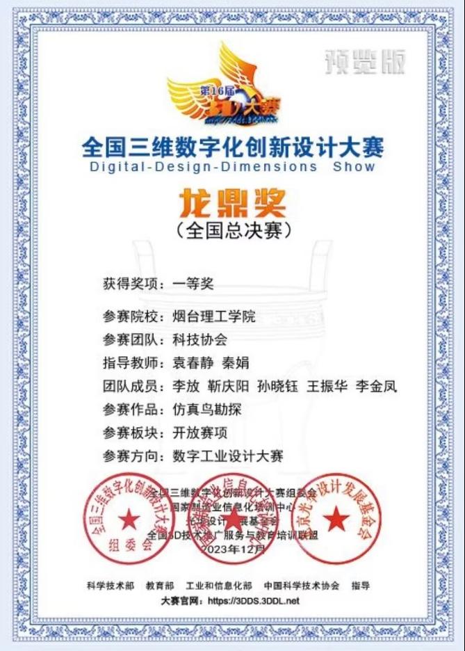 在袁春静老师和秦娟老师的指导下,太阳成集团tyc33455ccwww李放、靳庆阳等同学的参赛作品《仿真鸟勘探》通过运用三维数字化技术和创新设计理念,对仿真鸟无人机的设计和开发,借助先进的图像处理和数据分析算法,能够准确识别和定位地下矿藏、油气资源以及环境污染等关键信息,实现了对野外环境的高精度勘探和数据收集。该作品经过校赛、省赛层层选拔入围年度总决赛(国赛)参与角逐龙鼎大奖,最终荣获国家级一等奖,打破了公司有史以来该项赛事的获奖记录!