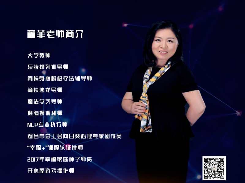 董菲老师,是烟台职业学院心理健康中心老师。自2014年开始学习心理学,师从李中莹老师,郑立峰老师,罗秋兰老师,赖明正老师等多位心理学界大咖进行学习和研究。简快幸福关系学准导师,系统整合训导师,幸福家家庭指导师,魔法学习导师,nlp执行师,还是烟台市总工会“向日葵”心理专家团成员。