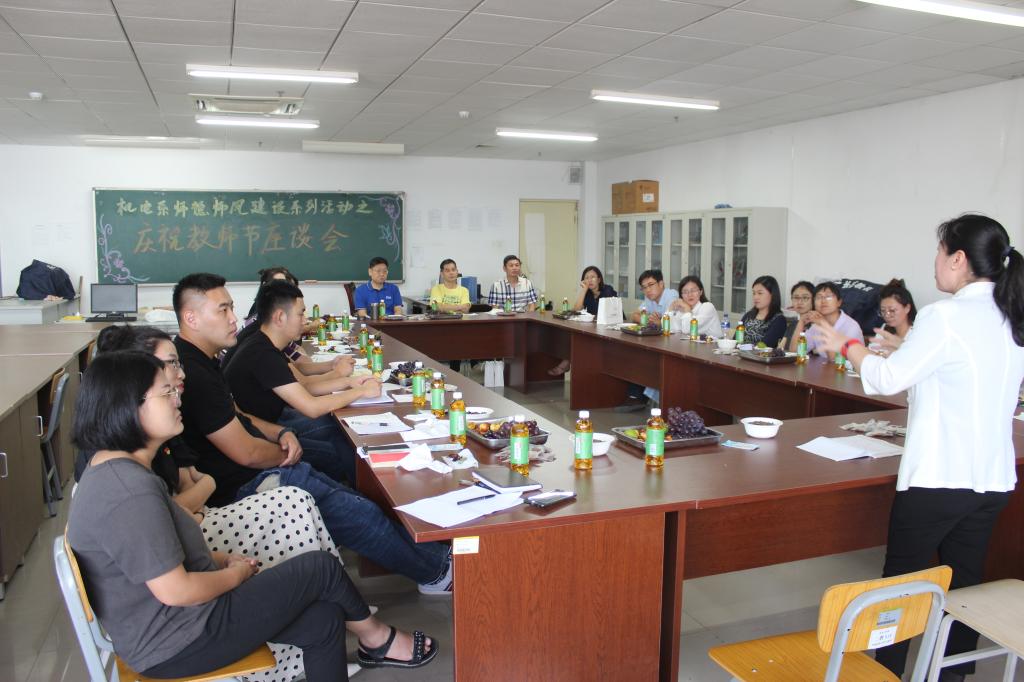 九月秋风送爽,丹桂飘香,为了增加老师们之间的交流,增进彼此之间的感情,并欢迎新老师加入机电工程系这个充满爱的大家庭,在教师节当天,机电工程系全体教职工于下午两点半在二教514召开机电系师德师风建设系列活动之庆祝教师节座谈会。