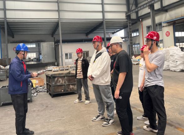 山东鲁电线路器材有限公司杨明圣老师为员工进行了安全教育和公司情况介绍。随后,员工分成四组,在山东鲁电工作人员的带领下前往不同的车间和实验室参观学习,企业导师为员工进行专业讲解:在铸造车间了解电路器材铸造过程和铸造工艺;在冲压、锻压车间熟悉冲压、锻压工艺和装备;模具车间观看模具的加工过程;检验实验室熟悉尺寸检验、力学性能试验等检验流程。认识实习结束后,山东鲁电线路器材有限公司为公司师生提供了丰盛的午餐,加强了员工对企业文化的认识。