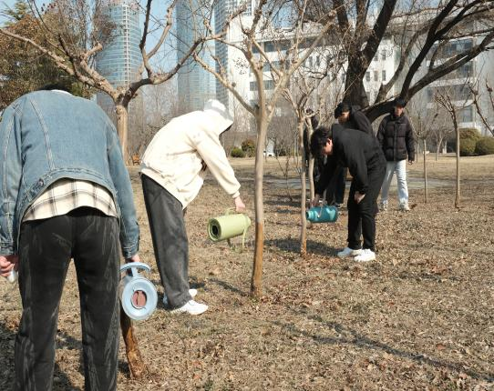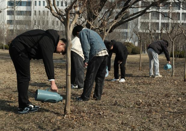 来到现场之后,大家合理分工,共同配合,戴好防护手套,在保障自身安全的前提下为小树苗进行松土、浇水等步骤,整个过程循序渐进,有条不紊,丝毫没有慌乱。虽然大多数同学都是第一次进行植树活动,但动作仔细,挥锹浇水,在和大自然的亲近中,为烟理工增添一份新的活力,溢出一方春光。