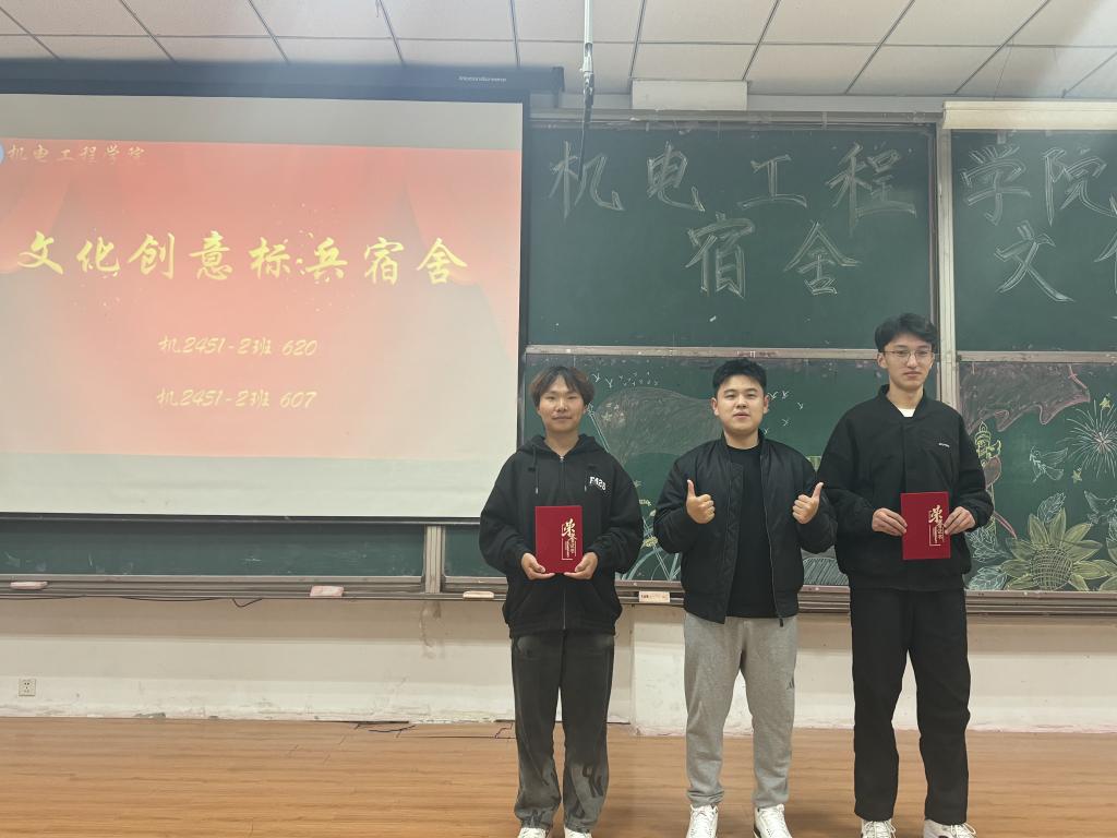 在热烈的气氛中,团总支书记韩聪聪和2024级辅导员杜泽辉为“卫生优秀标兵宿舍”“文化创意标兵宿舍”系列活动获奖代表颁发荣誉证书。获得男生卫生优秀标兵宿舍有:机2401-2班514、机2407-1班530、机2451-2班618;获得女生卫生优秀标兵宿舍有:机2403-1班116、机2401-2班116。获得文化创意标兵宿舍有:机2451-2班620、机2451-2班607。