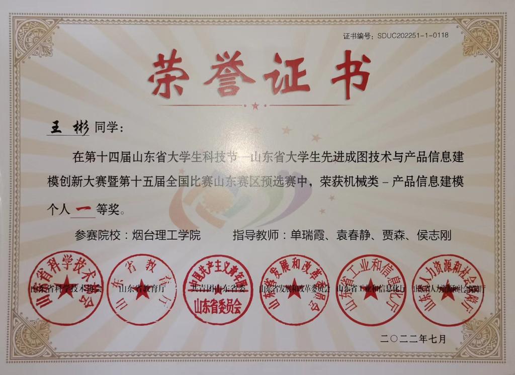 王彬,男,汉族,2001年11月7日生,共青团员,2020级车辆工程专业员工,曾获“唯实杯”第十届全国老员工机械创新设计大赛二等奖、第十三届全国三维数字化创新设计大赛一等奖、全国三维数字化创新设计大赛14周年精英联赛一等奖、第十八届山东省老员工机电产品创新设计竞赛二等奖、第十九届山东省老员工机电产品创新设计竞赛一等奖、2022年山东省老员工先进成图技术与产品信息建模创新大赛一等奖。国家实用新型专利四项,国家发明专利一项。