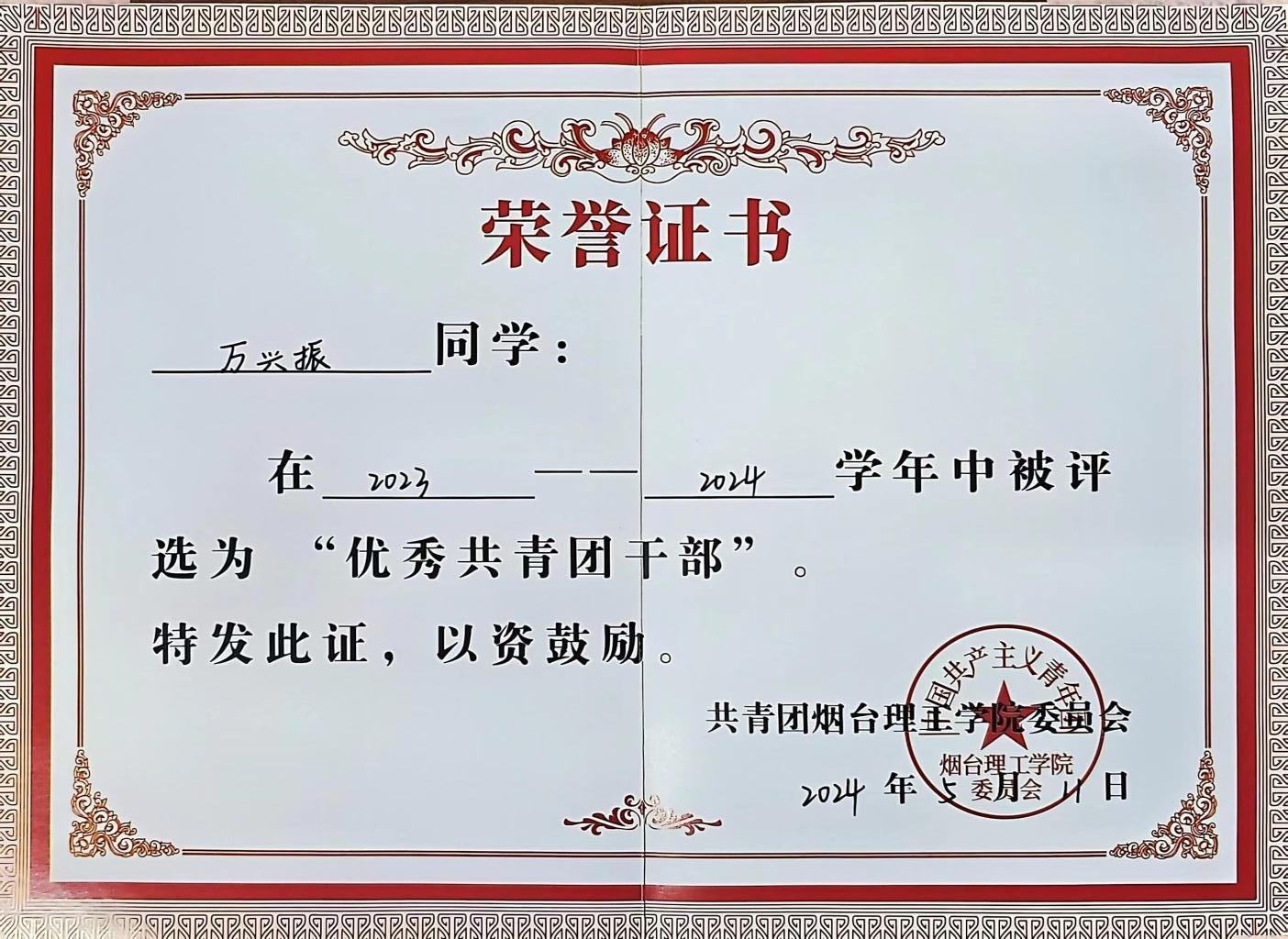 8.2024年5月荣获"优秀共青团干部"