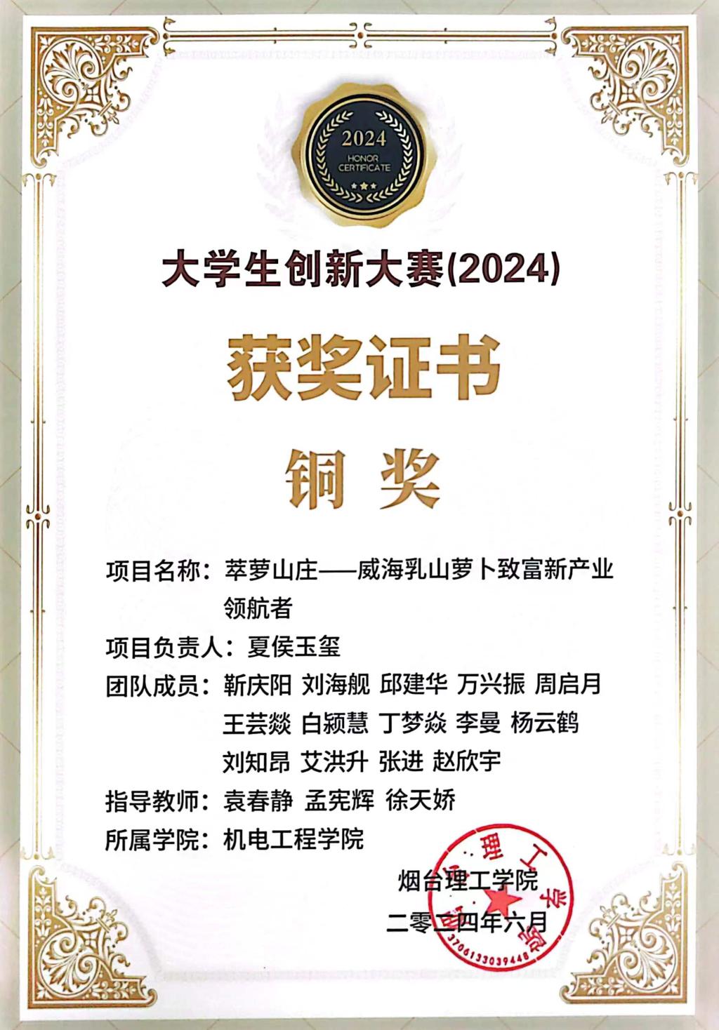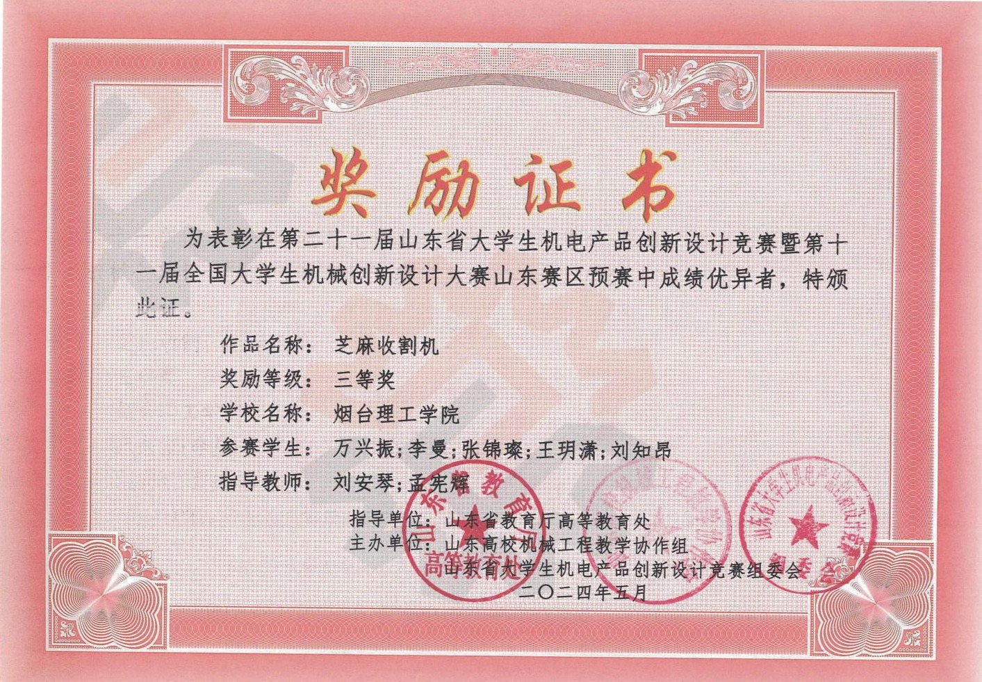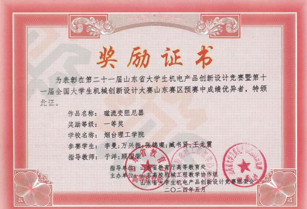 3.2024年5月荣获山东省机电产品创新设计竞赛省级一等奖、三等奖