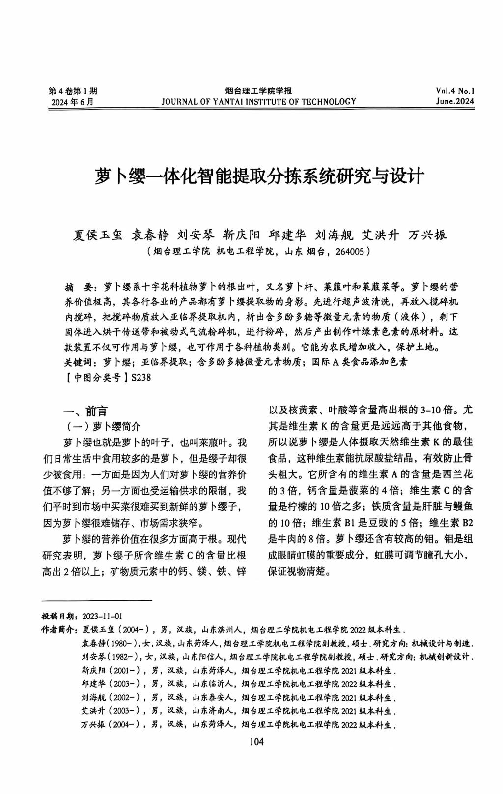 12.2024年6月发表“萝卜缨一体化智能提取分拣系统研究与设计”校刊一篇(队员)