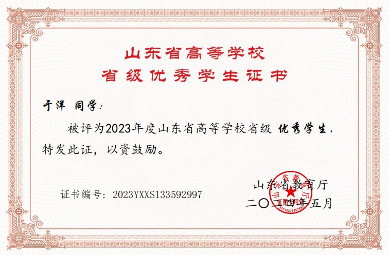 自入大学,于洋始终把学业放在首位。平日里,认真对待每一门专业课程,十分注重拓宽自己的专业知识,优化自身知识结构,培养自己的实践能力以及全方位思考的能力。积极与老师同学沟通,取长补短,激发自己的学习兴趣并增强自己的自学能力。2023-2024学年智育成绩与综合测评双第一,已通过英语四级考试,曾荣获省政府奖学金、省级优秀员工、优秀员工荣誉称号、学习标兵等荣誉。