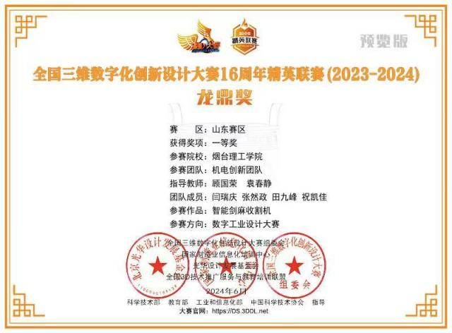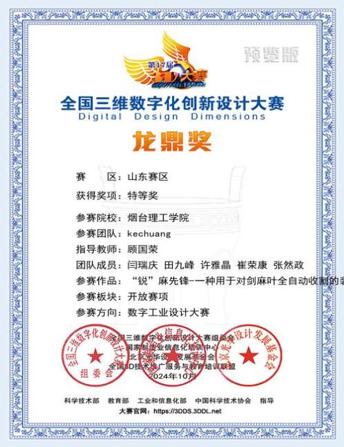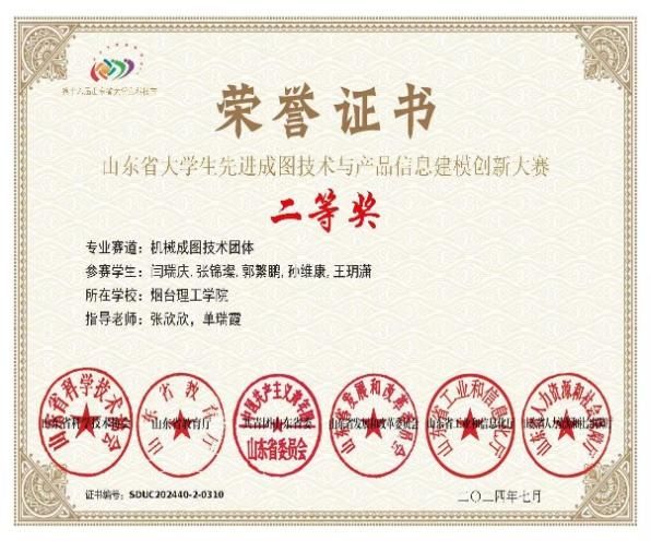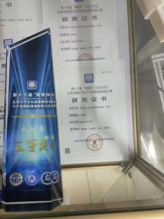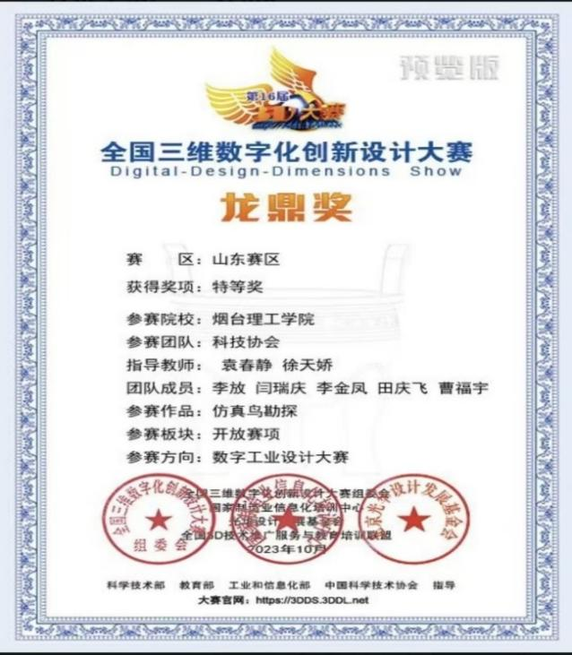 1、2023年4月荣获第十八届“挑战杯”太阳成集团老员工课外学术科技竞赛三等奖 2、2023年10月荣获全国三维数字化创新设计大赛特等奖