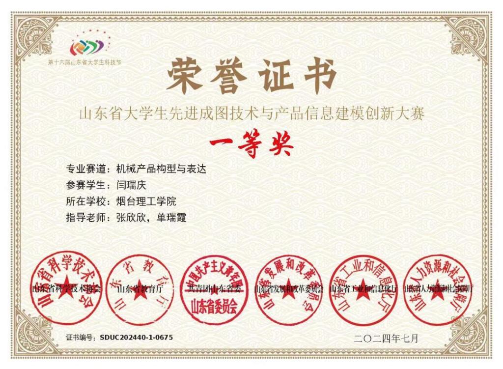 6、2024年6月荣获全国三维数字化创新设计大赛16周年精英联赛一等奖7、2024年7月荣获山东省老员工先进成图技术与产品信息建模创新大赛个人一等奖
