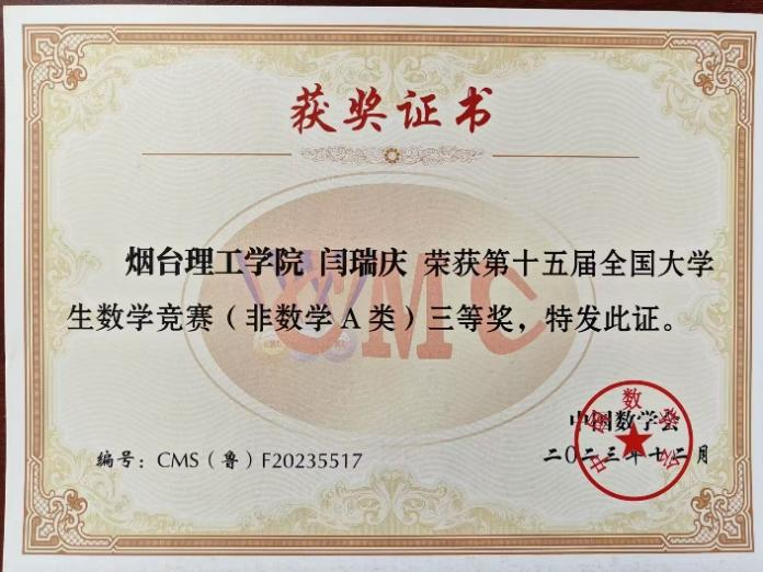 4、2023年10月荣获第十五届全国老员工数学竞赛三等奖